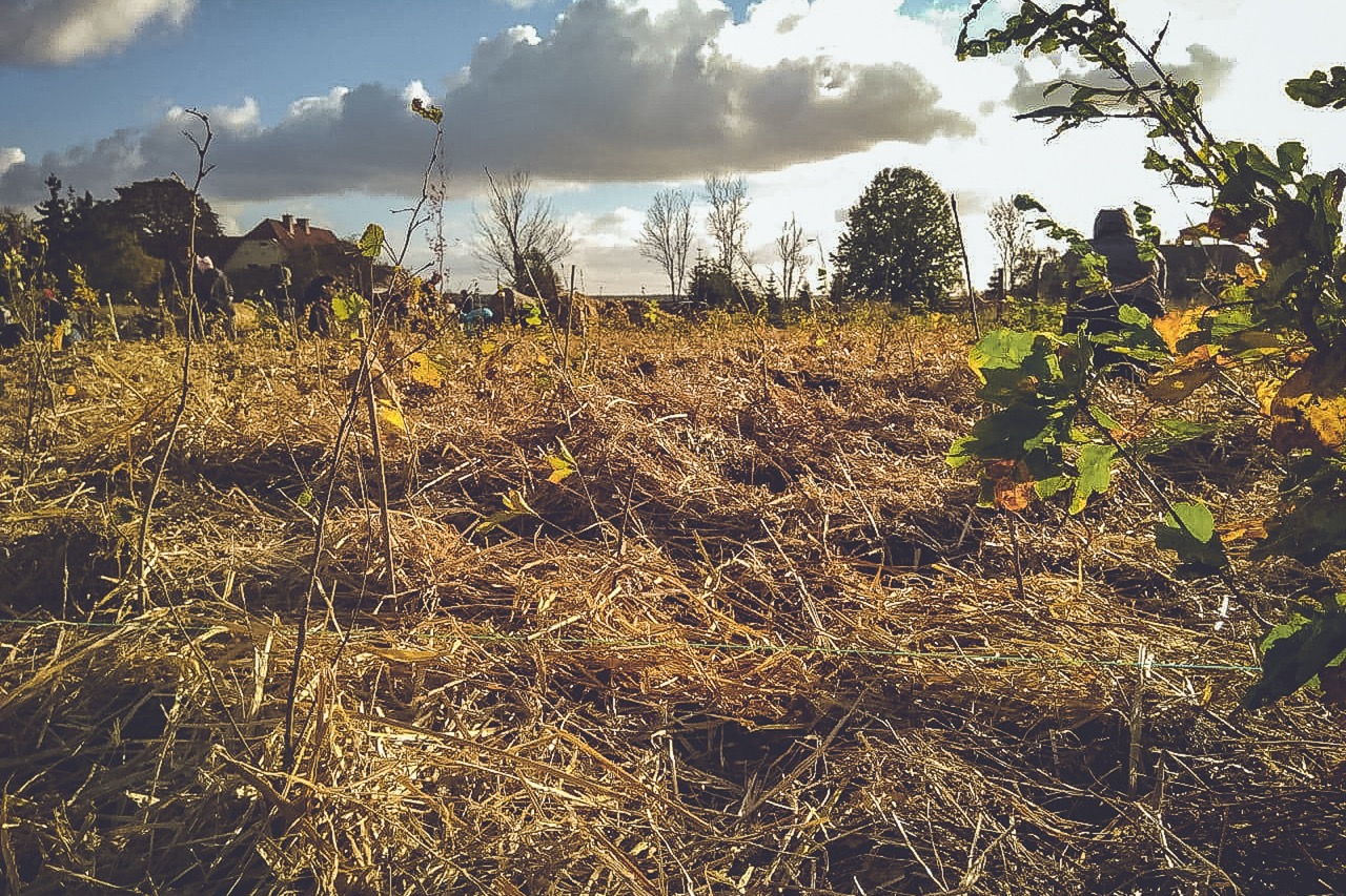 Am Morgen des 23. Oktober geht es schließlich los. Pünktlich um 10 Uhr haben sich bereits etwa 50 Menschen an der Fläche eingefunden und warten auf ihre Einweisung. Wie erhofft ist es eine bunte Truppe aus Jung und Alt, Polen und Deutschen sowie Menschen aus der Stadt und vom Dorf. Noch leicht verfroren gibt es an diesem kalten Morgen ein Willkommenheißen der Gäste und eine Einführung in die Miyawaki-Methodik. Als die Menschen dann etwas später beginnen zu pflanzen, reißt der Himmel auf und fortan sind wir mit einem herrlich sonnigen Herbstwetter gesegnet.
