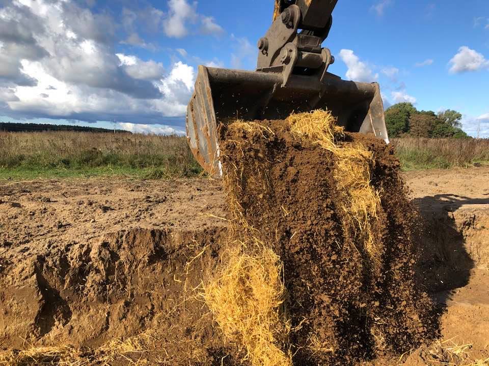 Mitte Oktober konnten nach ausführlicher Planung endlich die Bodenvorbereitungen beginnen. In den verdichteten und verarmten Lehmboden wurde mit Hilfe von zwei Baggern Stroh und verschiedene Arten Kompost eingearbeitet. Vielen Dank an dieser Stelle an unseren sehr liebgewonnenen Baggerfahrer „Mister Wlodek“, der einen klasse Job machte! Schon während dieser Tage wurde klar, dass es bei dem Projekt um viel mehr als nur die Pflanzung eines Waldes gehen sollte. Die unglaubliche Gastfreundschaft der Menschen der Fundacja Perspektywa, ihre beeindruckende Organisation und ihre Motivation selbst mit anzupacken, machten die Bodenbearbeitung zu einem sehr verbindenden Erlebnis. Es dauerte etwa eine Woche, bevor die Fläche bereit war bepflanzt zu werden.