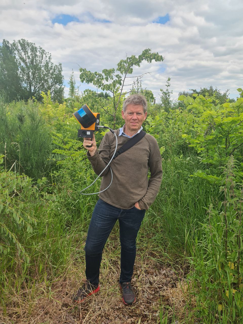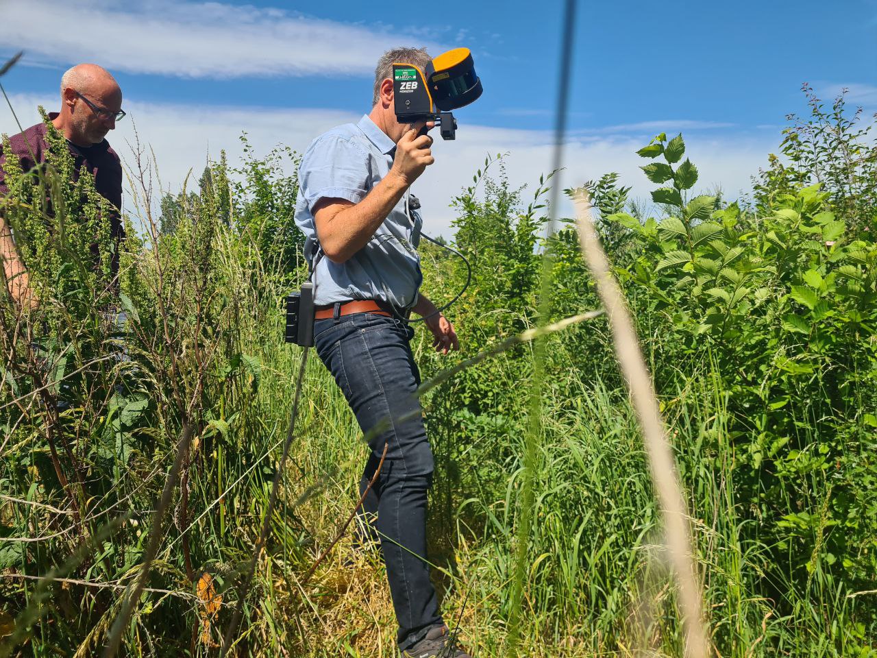 Am 13.06. haben wir mit Professor Dr. Mund von der Hochschule für nachhaltige Entwicklung Eberswalde und der Forschungsgruppe IT4forests den nächsten Laserscan unseres Tiny Forests in der Uckermark durchgeführt. Dabei kam die Technologie von Geoslam zum Einsatz. Der 20m x 45m große Tiny-Forest wurde im Frühjahr 2022, im Frühjahr 2023 sowie im Sommer 2023 mit Hilfe des Geoslam Handlasers vermessen und analysiert. Nach dem Scannen der Felddaten folgten mehrere Schritte der Datenvorverarbeitung und -analyse, wie z. B. das Ausschneiden der Geodaten, die Ausdünnung der Punktwolke und die Volumenberechnung, die Normalisierung des Geländes, die Segmentierung des Wassereinzugsgebiets und die Rekonstruktion der bewachsenen Oberfläche.