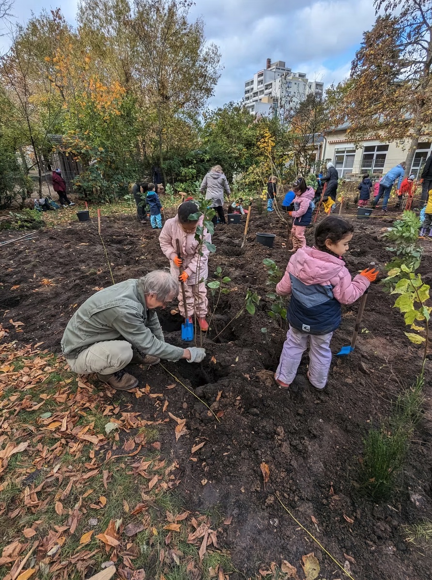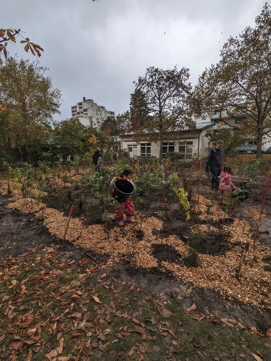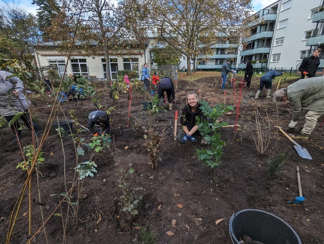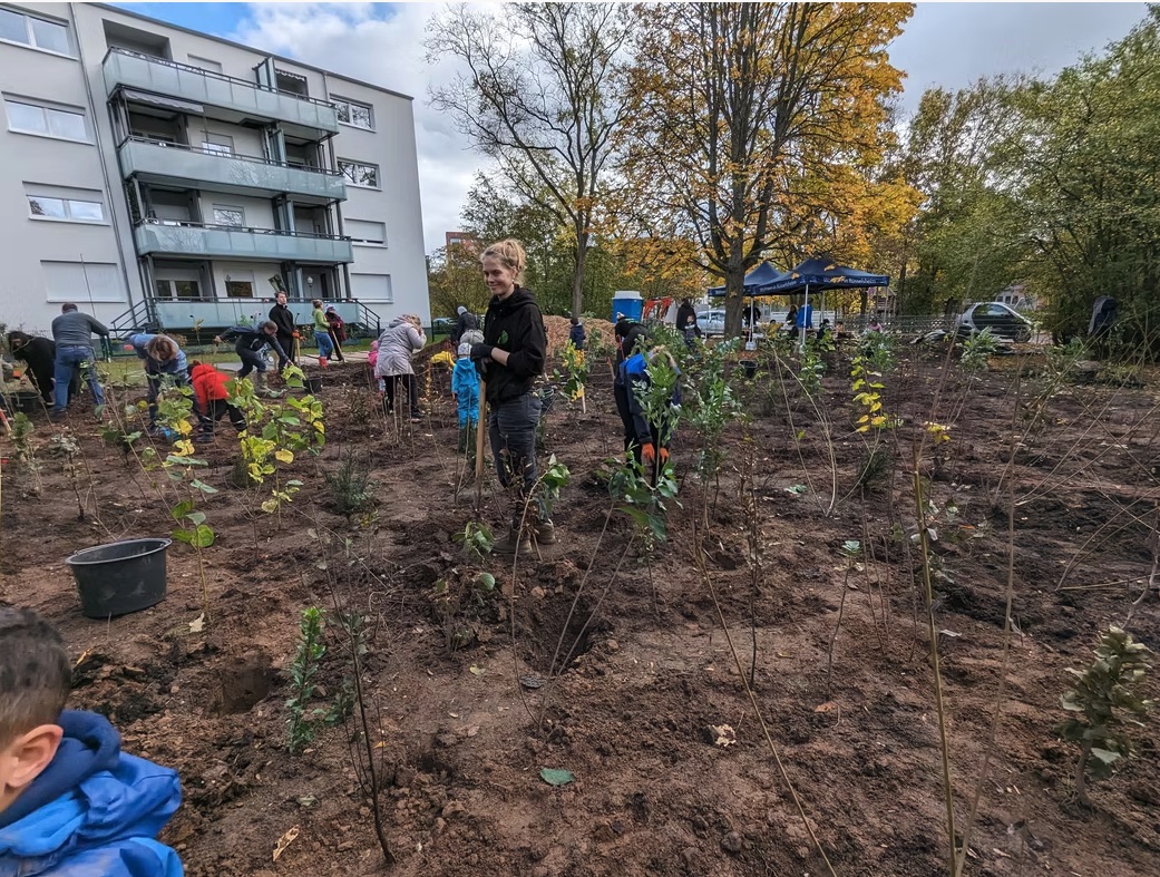 Am 06.11.2023 haben wir mit ca. 25 Kindern Eltern, Erzieher*innen der städtischen Kita Paul-Ehrlich-Straße, Mitarbeitenden der gewobau Rüsselsheim und weiteren freiwilligen Helfer*innen den ersten ca. 280 qm großen Tiny Forest in Rüsselsheim gepflanzt.