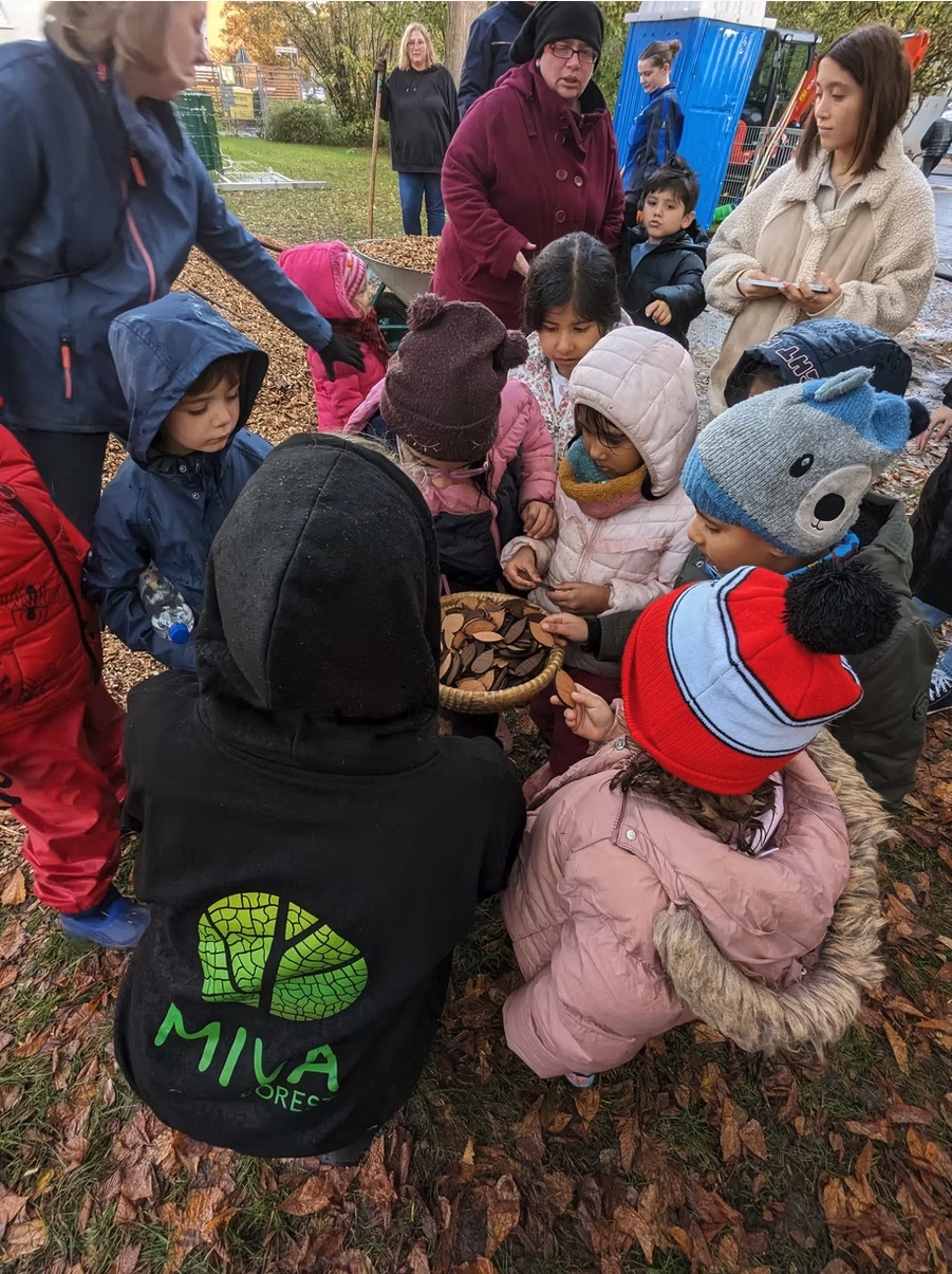 Ein kurzer Weg führt zu einer kleinen Aufenthaltsfläche, wo entspannt, beobachtet und etwas über die Natur gelernt werden kann. Trotz Regen hat es allen großen Spaß gemacht und am Ende des Tages haben die Kinder noch ihre Tiny Forest-Urkunden und ein kleinen Holzblatt-Anhänger als Dankeschön bekommen :)